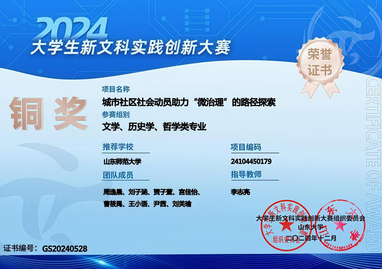 近日,由山东大学主办的首届2024大学生新文科实践创新大赛在山东济南落幕。由学部教师李志亮指导,学部学生周逸晨、刘子涵、贾子萱、宫佳怡、曹筱禺、王小语、尹茜、刘芙瑜、胡渊博共同参与完成的作品《城市社区中社会动员助力“微治理”的路径探索》荣获铜奖。