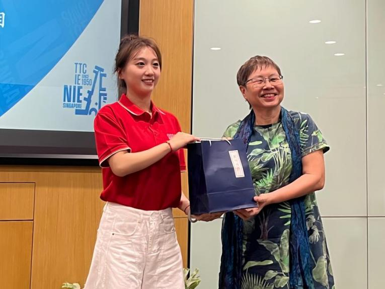 付雨婷代表学部向林秀丽赠送中国传统艺术品,进一步深化365英国上市与南洋理工大学国立教育学院的深厚友谊。