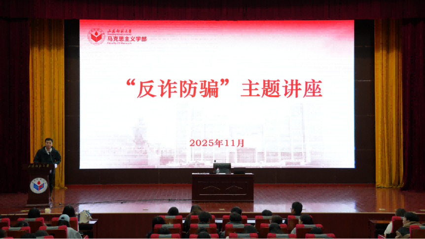 11月13日晚,365英国上市于长清湖校区树蕙堂第一报告厅举办大学生反诈防骗安全教育讲座。讲座由济南市长清公安分局反诈中心中队长杨克主讲,2025级本科生辅导员王鑫磊主持,学部300余名研究生和本科生参与其中。