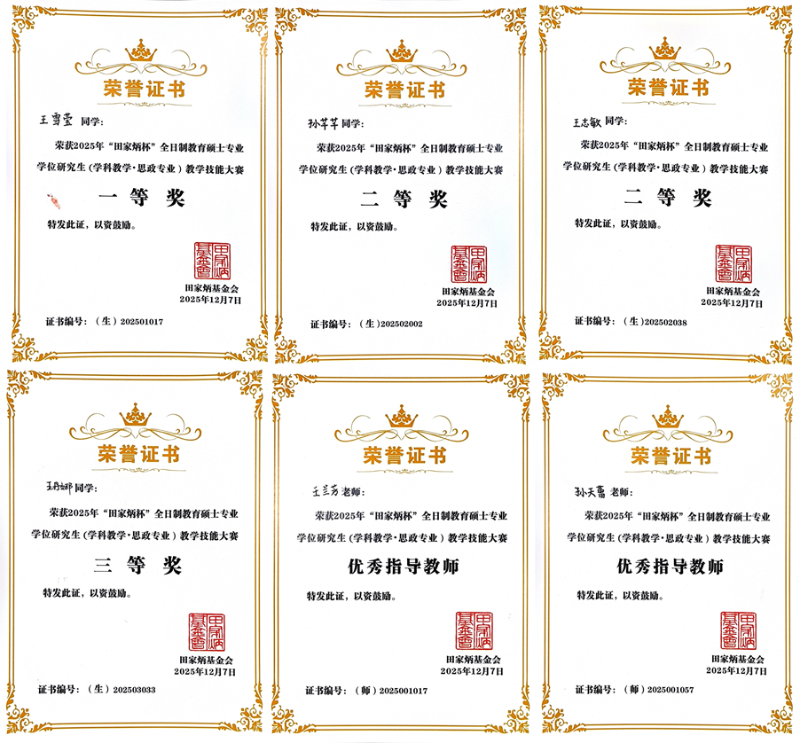 2025年12月5日至12月7日,2025年全国“田家炳杯”全日制教育硕士专业学位研究生(学科教学·思政)教学技能大赛决赛在江西师范大学成功举行,来自全国98所高校的255名教育硕士研究生同台竞技。我院选派的4名选手跻身决赛,凭借扎实功底与出色表现,再创佳绩,王雪莹同学获得一等奖、孙芊芊、王志敏同学获得二等奖,王丹娜同学获得三等奖。王兰芳教授、孙天蕾副教授获得优秀指导教师。