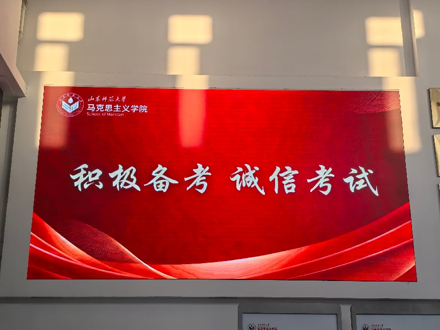 考场布置工作提前规划,制定工作方案,明确任务分工;对教室进行设施全面复检与深度清理,有序推进考场整理、考号张贴、座位号标示、电子时钟校准等工作;及时下发考试考场安排通知,确保师生清晰知晓考试相关事宜;对考场内的桌椅、地面、讲台等区域进行全方位清扫,细致清理卫生死角,以整洁明净的环境为考生营造舒适的考试氛围。各考场的黑板上均以醒目字体书写“积极备考,诚信考试”的诚信标语,并在学院一楼大厅播放诚信考试倡议。师生协作下,本次考场布置工作高效完成,为期末考试的顺利进行做好充分准备。