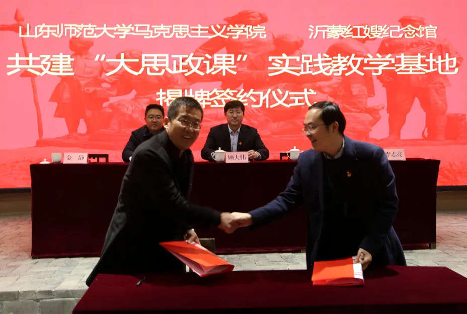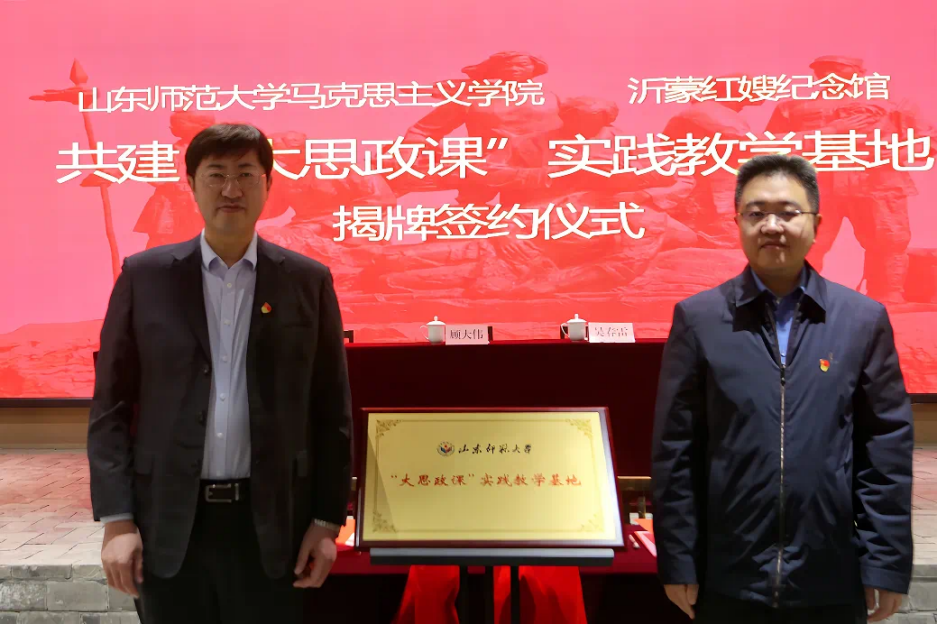 仪式上,顾大伟、刘晓蕾共同为英国365集团公司马克思主“大思政课”实践教学基地揭牌。吴春雷与沂南县党性教育基地副主任范传永签订《共建“大思政课”实践教学基地合作协议书》。
