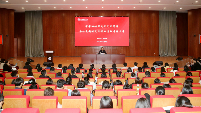 冯继康从深刻领悟习近平文化思想的丰富内涵、深刻把握学习宣传贯彻习近平文化思想的逻辑必然、以青春之力勇担新的文化使命三个方面,阐述了习近平文化思想的理论贡献、重大意义和实践要求,号召同学们勇挑重担、担当大任,自觉肩负起推动文化繁荣、建设文化强国、建设中华民族现代文明的历史使命。