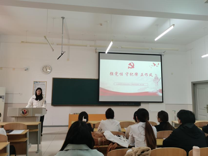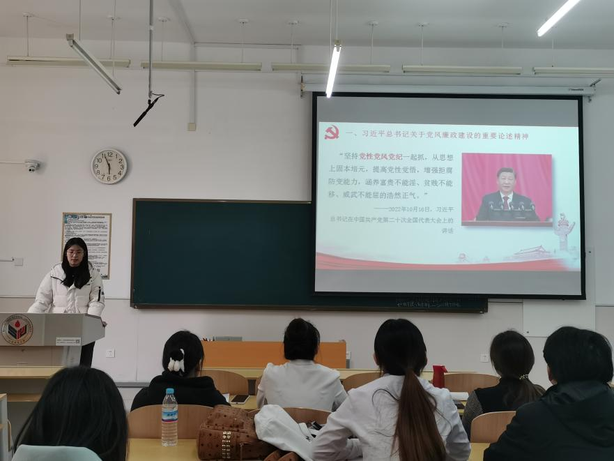 支部宣传委员战祥鸽为全体党员讲授《强党性 守纪律 正作风》党纪学习教育专题党课。党课围绕习近平总书记关于党风廉政建设的重要论述精神、党的纪律和作风建设的重要性以及大学生党员如何严明纪律底线展开,引导学生党员坚定理想信念、筑牢思想防线、树立廉洁意识,锤炼党性修养。