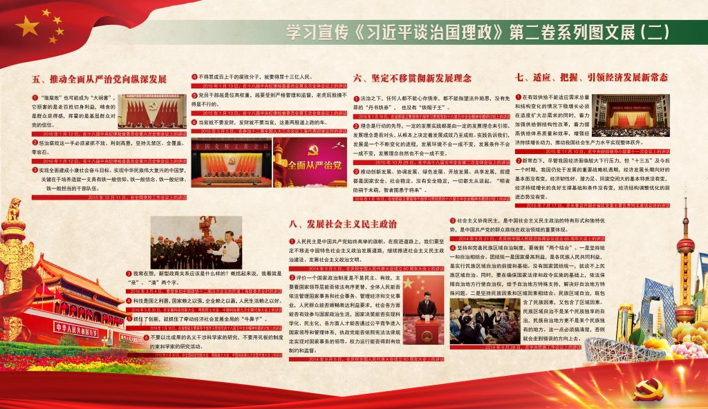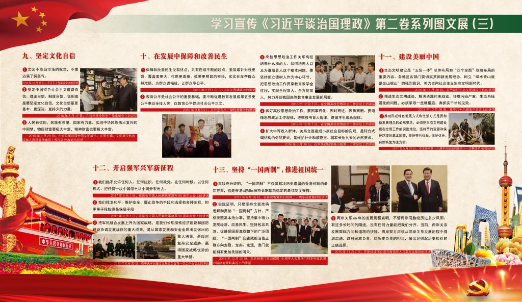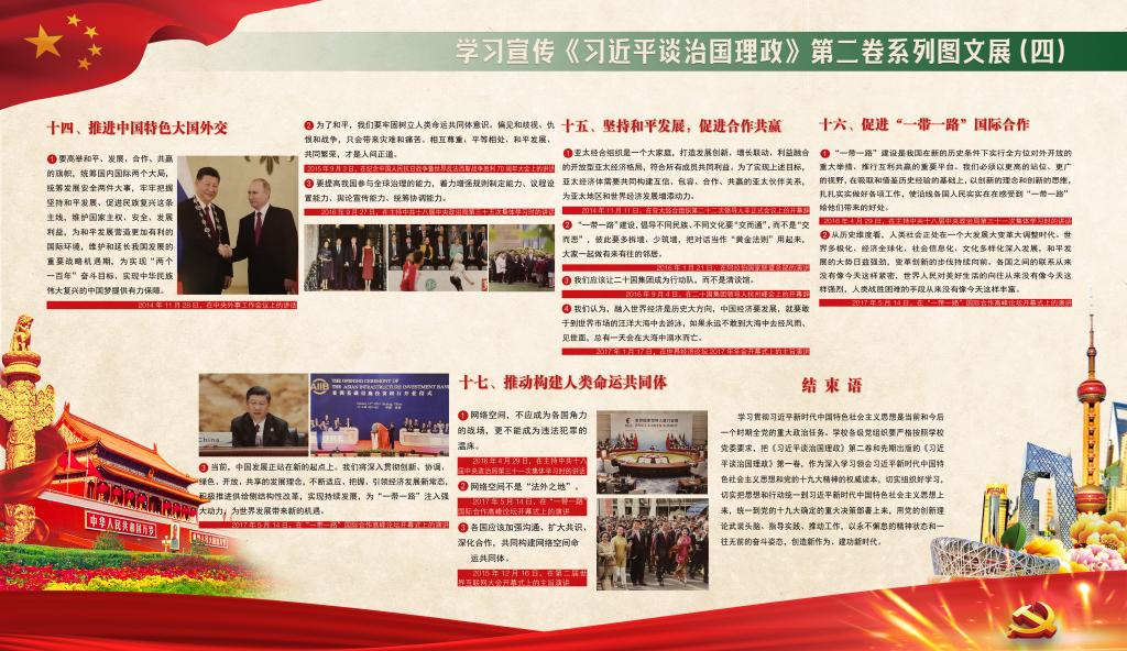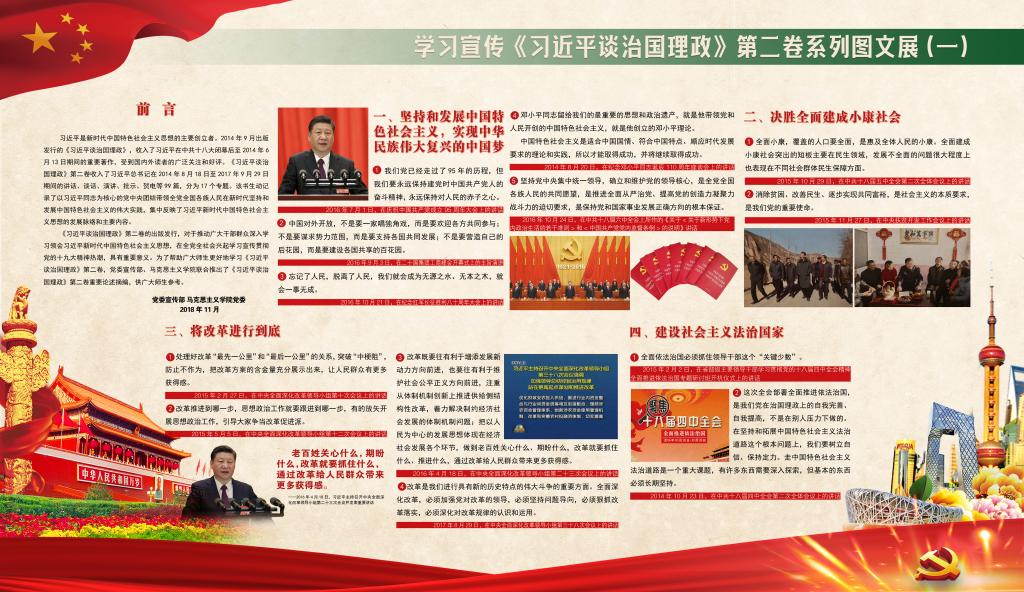 本次学习宣传《习近平谈治国理政》第二卷系列图文展共布置4块展板,内容涵盖坚持和发展中国特色社会主义,实现中华民族伟大复兴的中国梦;决胜全面建成小康社会;将改革进行到底;建设社会主义法治国家;推动全面从严治党向纵深发展;坚定不移贯彻新发展理念;适应、把握、引领经济发展新常态;发展社会主义民主政治;坚定文化自信;在发展中保障和改善民生;建设美丽中国;开启强军兴军新征程;坚持“一国两制”,推进祖国统一;推进中国特色大国外交;坚持和平发展,促进合作共赢;促进“一带一路”国际合作;推动构建人类命运共同体等十七个专题,生动记录了以习近平同志为核心的党中央团结带领全党全国各族人民在新时代坚持和发展中国特色社会主义的伟大实践,集中反映了习近平新时代中国特色社会主义思想的发展脉络和主要内容,充分体现了我们党为推动构建人类命运共同体、促进人类和平与发展事业贡献的中国智慧和中国方案。