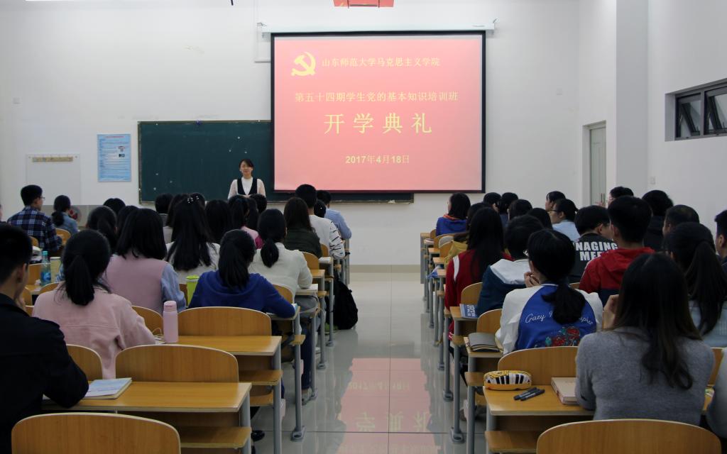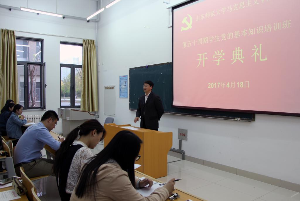 4月18日,英国365概况于长清湖校区马院综合楼108教室举行第五十四期学生党的基本知识培训班开班典礼。学院党委副书记吕晓勇,学院辅导员老师王雪、魏强、张玲玉以及第五十四期党基班全体学员参加了开班典礼。开班仪式由王雪主持。