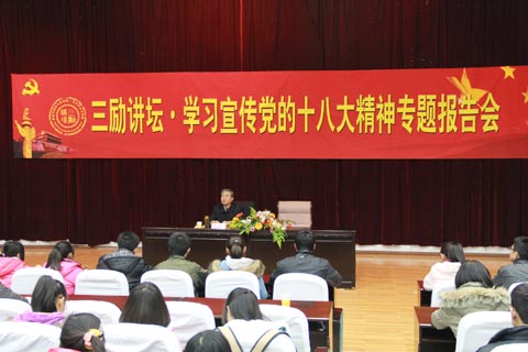 为加强十八大精神的学习和宣传工作,学院制定了切实可行的《学习宣传党的十八大精神实施意见》。本次报告会是学院十八大系列报告会之首场,也是学习宣传十八大精神计划的重要组成部分。学院将充分利用学科专业优势,分学习领会、宣传研读、联系实际、贯彻落实四个阶段,不断加强理论学习,广泛开展内容丰富、形式多样的活动,组织广大师生认真、全面、细致地学习党的十八大精神,真抓实干,谱写科学发展的新篇章!