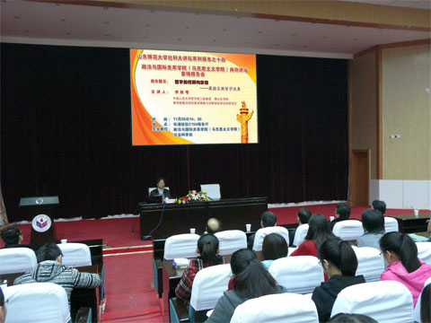 11月26日,学院尚功讲坛首场报告会暨英国365集团公司社科大讲坛系列报告在长清校区C154报告厅举行,中国人民大学哲学院二级教授、博士生导师、教育部重点研究基地佛教与宗教理论研究所研究员李秋零教授应邀作了题为《哲学如何解构宗教—康德宗教哲学述要》的学术报告,社科处副处长刘浩、学院院长马永庆、党委书记房增福、副书记吕晓勇及300余名师生聆听了报告会。本次报告会由马永庆主持。